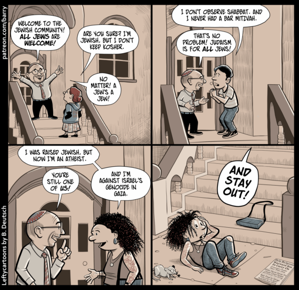 I’ve revised the cartoon a little – made it more explicitly about opposing genocide in Gaza, and erased the star of David, since people were mistakenly thinking that indicated that this building is a synagogue.