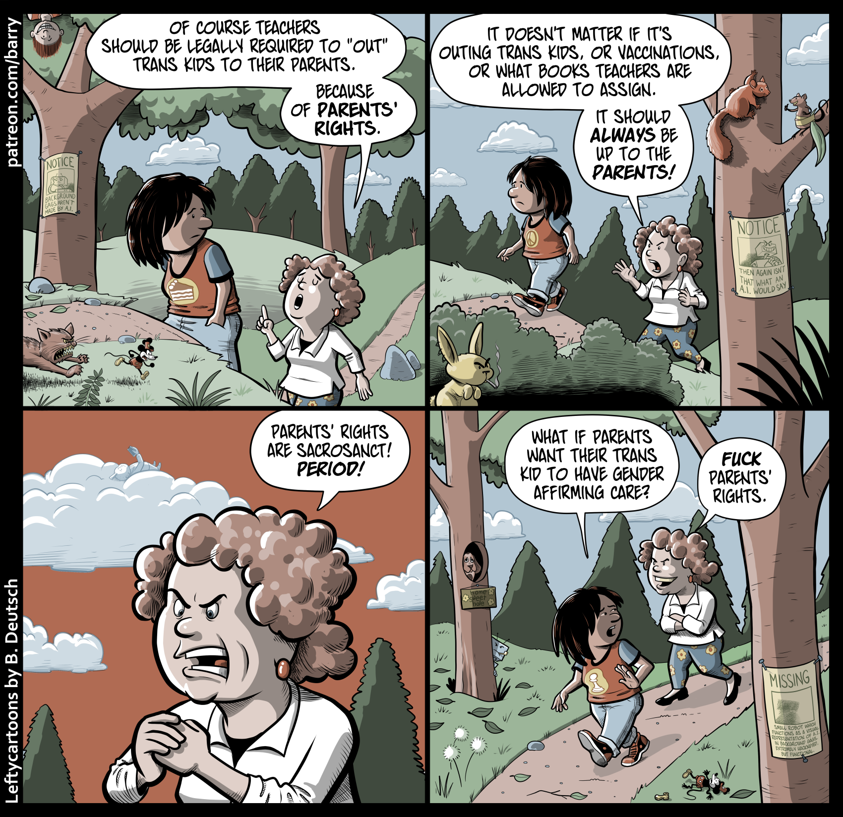 PANEL 2: An evil-looking bunny is behind the bush, smoking a cig. High in a tree, a rat has disguised itself as a squirrel by taping a big leaf to its real end, and is trying to pass itself off to a real squirrel. A notice nailed to the tree has a picture of an evilly grinning robot and says “NOTICE: Then again isn’t that what an A.I. would say.”