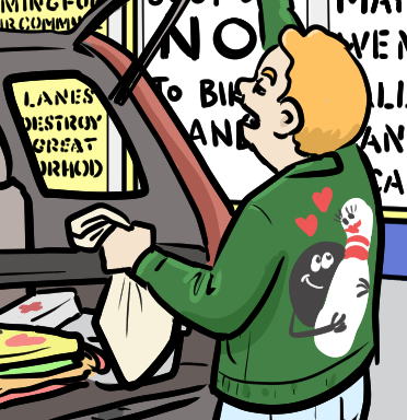 A guy in a green jacket is taking a bag out the back of his hatchback. In the background, The Furniture King’s huge display windows are completely covered with signs such as “Call You Mayor We Need All 4 Lanes” and “How Will YOU Get Home?” There’s a tree with pretty autumn leaves.