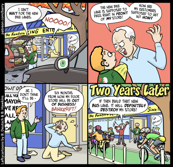 STORE OWNER: The new bike lane is supposed to pass right in front of my store! How are my customers supposed to get in? How?