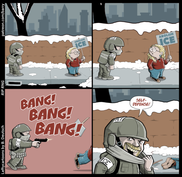 I went back and forth on how malicious and evil to make the ICE agent in the final panel. Then I read about the ICE shooting of Marimar Martinez, just two months before Good’s death. Martinez, like Good, was accused by an ICE agent of trying to kill him with her car. Martinez, despite being shot five times, survived, and the case against her was so weak the government quietly dropped all charges.