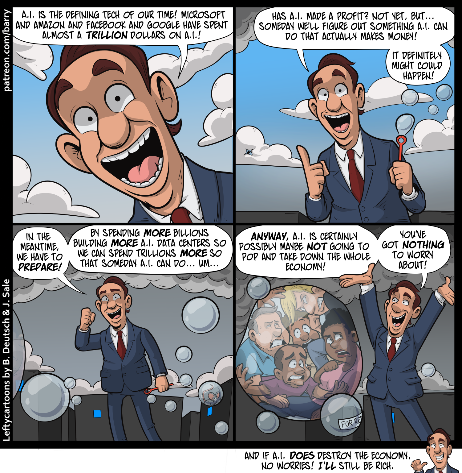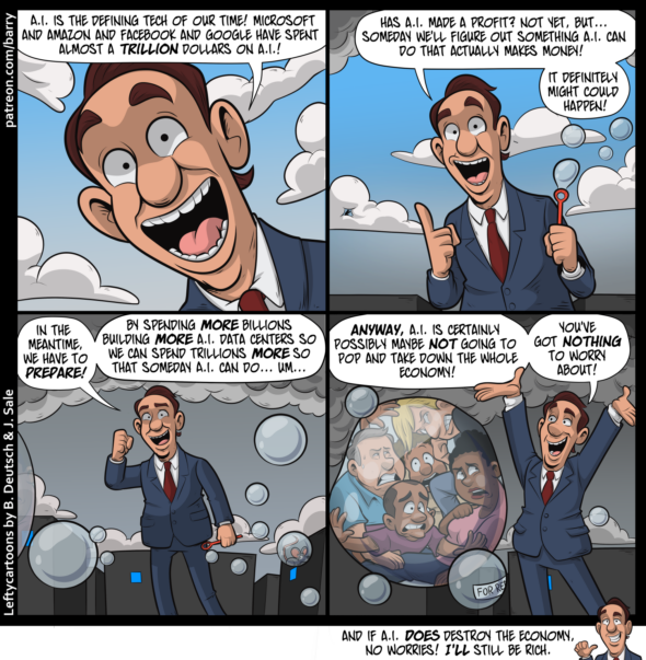 MAN: In the meantime, We have to prepare! By spending more billions building more A.I. data centers so we can spend trillions more so that someday A.I. can do… Um…