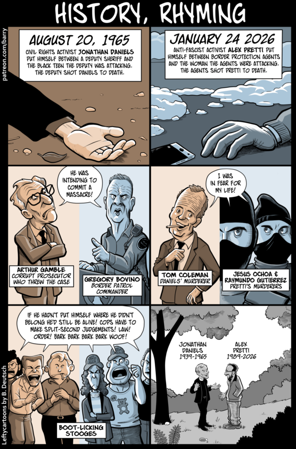 But I do take comfort imagining Alex Pretti and Jonathan Daniels meeting, as impossible as that is, and finding a lot to talk about. I know that’s just my imagination, but if others take comfort from believing these two heroes are in Heaven, that’s fine with me.