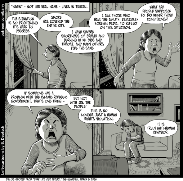 I read Daniel Larison’s post “The Poisoning of Tehran,” in which he quoted “Nagin” extensively. (The Guardian described Negin as “an activist and former political prisoner.”) I decided I should do a cartoon amplifying Negin’s voice. Obviously, the amplification I can provide is trivial, compared to a huge outlet like The Guardian or a well-known writer like Larison – but we all do what we can with the tools we have, right?